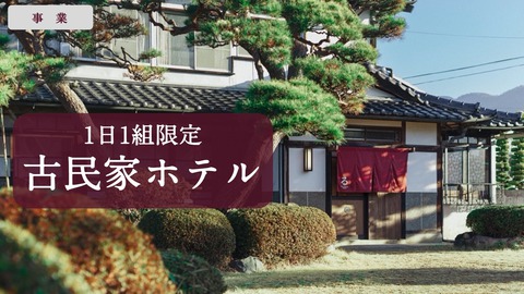 失われつつある貴重な古民家物件を次世代に継承することを目指し、会社所属の職人チームがその土地ならではの文化体験とハレの日の演出にこだわってリノベーションを行った古民家ホテルを、オーナー制度とフランチャイズ展開により運営し、地域の価値の創出に繋げる「地方再興」事業を行っています。