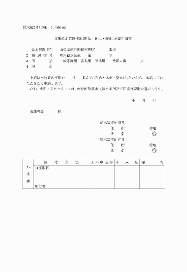 (1) 給水装置の使用を開始し、廃止、又は休止しようとするときは、専用給水装置使用(開始・休止・廃止)承認申請書(様式第2号)の提出をもって行う。