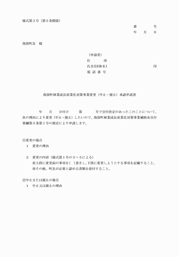 第6条 補助対象者は、補助事業に着手したときは速やかに町長に南部町林業成長産業化対策事業着手届(様式第5号)を提出しなければならない。