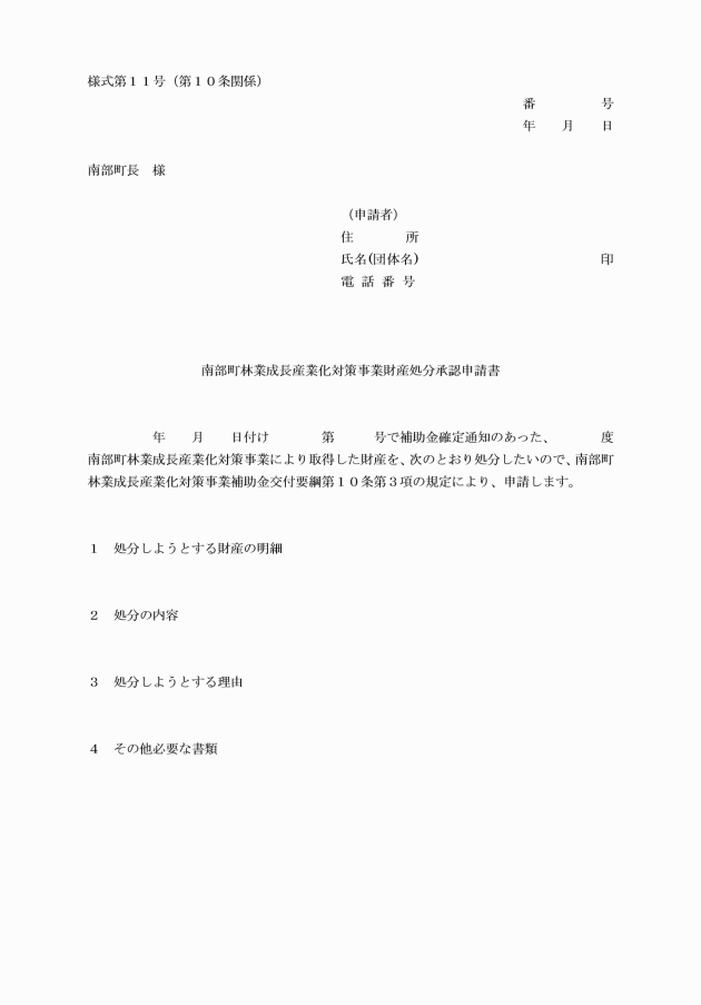 第4条 補助対象者は、補助金の交付を受けようとするときは、南部町林業成長産業化対策事業補助金交付申請書(様式第1号)に必要な書類を添付して、事業実施予定日の20日前までに町長に提出しなければならない。ただし、当該補助金を受けて既に補助事業を行っている補助対象者は、その補助事業により取得し、又は効用の増加した財産(以下「補助対象財産」という。)について「減価償却資産の耐用年数等に関する省令」(昭和40年大蔵省令第15号)に定められている耐用年数に相当する期間内において、同一の事業種目に対する補助金の申請をすることはできない。