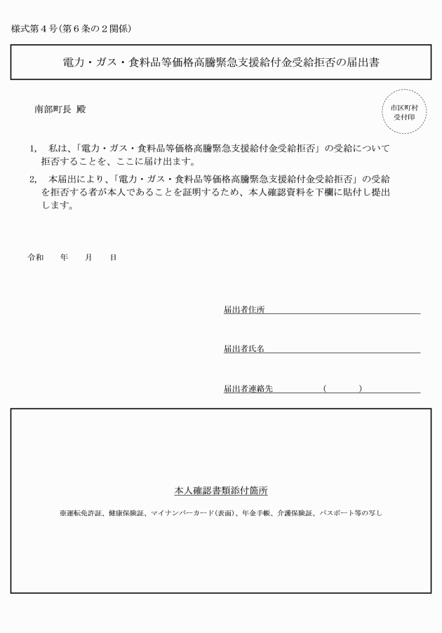 2 代理人が価格高騰緊急支援給付金の確認書の提出をするときは、確認書の委任欄への記載を、支給の申請をするときは、当該代理人は申請書に加え、原則として委任状を提出する。また、この場合、町は、公的身分証明書の写し等の提出又は提示を求めること等により、代理人が当該代理人本人であることを確認する。